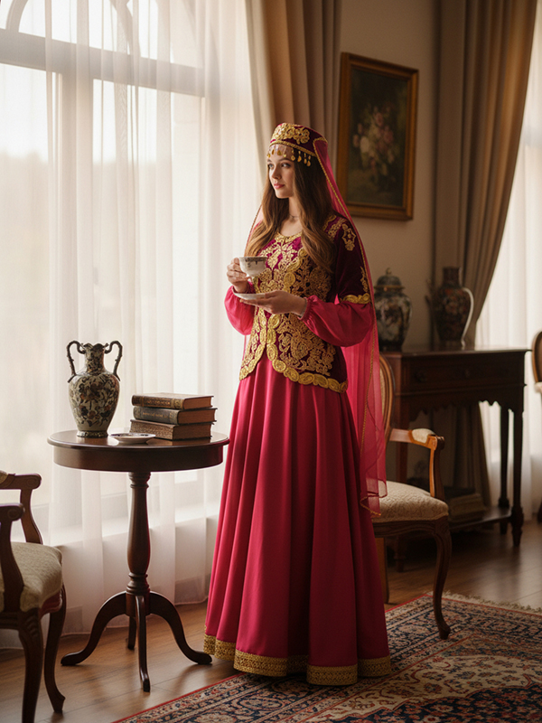 Özenle tasarlanmış başlık ve uyumlu aksesuarlar, bu kıyafeti yalnızca bir elbise değil, kültürel bir zarafet ifadesi hâline getirir. Özel davetler, kültürel etkinlikler, nişanlar ve geleneksel kutlamalar için ideal bir tercihtir.